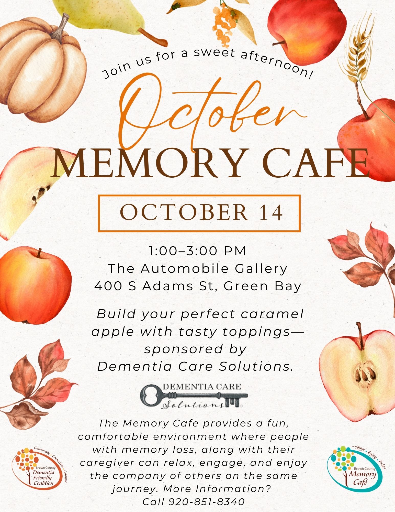Build your perfect caramel apple with tasty toppings- sponsored by Dementia Care Solutions. Every Memory Cafe provides a fun, comfortable environment where people with memory loss, along with their caregiver […]
