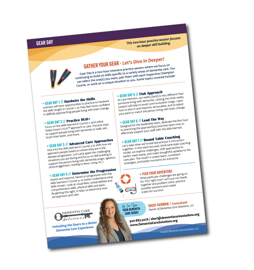 Gear Day is a two hour intensive practice session where we focus on continuing to build on skills specific to a variety areas of dementia care tailored to your unique situation and challenges.